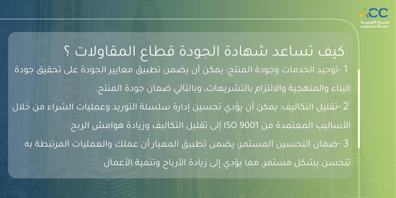 كيف تساعد شهادة الجودة قطاع المقاولات ؟ 1- توحيد الخدمات وجودة المنتج: يمكن أن يضمن تطبيق معايير الجودة على تحقيق جودة البناء والمنهجية والالتزام بالتشريعات، وبالتالي ضمان جودة المنتج. 2- تقليل التكاليف: يمكن أن يؤدي تحسين إدارة سلسلة التوريد وعمليات الشراء من خلال الأساليب المعتمدة من ISO 9001 إلى تقليل التكاليف وزيادة هوامش الربح. 3- […]