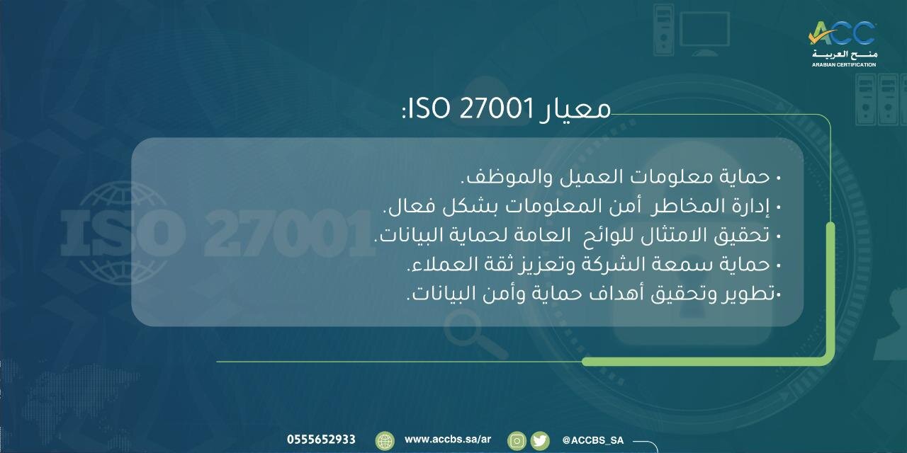 يوفر معيار ISO 27001 إطارًا لأفضل ممارسات إدارة أمن المعلومات التي تساعد المؤسسات على: • حماية معلومات العميل والموظف. • إدارة مخاطر أمن المعلومات بشكل فعال. • تحقيق الامتثال للوائح العامة لحماية البيانات. • حماية سمعة الشركة وتعزيز ثقة العملاء. • تطوير وتحقيق أهداف حماية وأمن البيانات