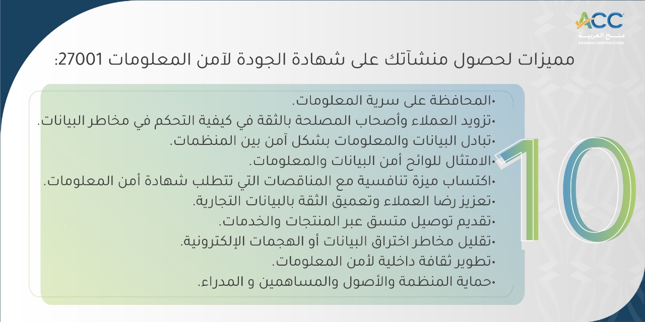 10 مميزات لحصول منشآتك على شهادة الجودة لآمن المعلومات 27001: • المحافظة على سرية المعلومات. • تزويد العملاء وأصحاب المصلحة بالثقة في كيفية التحكم في مخاطر البيانات. • تبادل البيانات والمعلومات بشكل آمن بين المنظمات. • الامتثال للوائح أمن البيانات والمعلومات. • اكتساب ميزة تنافسية في المناقصات التي تتطلب شهادة أمن المعلومات. • تعزيز رضا […]