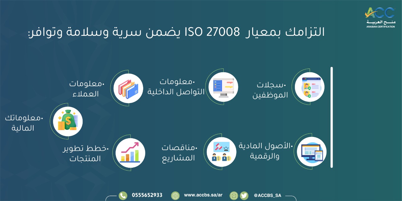 التزامك بمعيار ISO 27008 يضمن سرية وسلامة وتوافر: • سجلات الموظفين • معلومات التواصل الداخلية • معلومات العملاء • الأصول المادية والرقمية • مناقصات المشاريع • خطط تطوير المنتجات • معلوماتك المالية